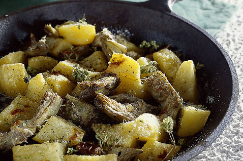 • Sbucciare e lavare le patate,  tagliare  a pezzettoni grossi, sbollentarle in acqua poco salata per 15 minuti, scolarle e  aggiungerle ai carciofi assieme ad  un pò di acqua tiepida. Aggiungere acqua quanto basta a coprire a filo i carciofi e patate. Cuocere a fiamma moderata per altri 10 minuti con il coperchio, controllando di tanto in tanto.